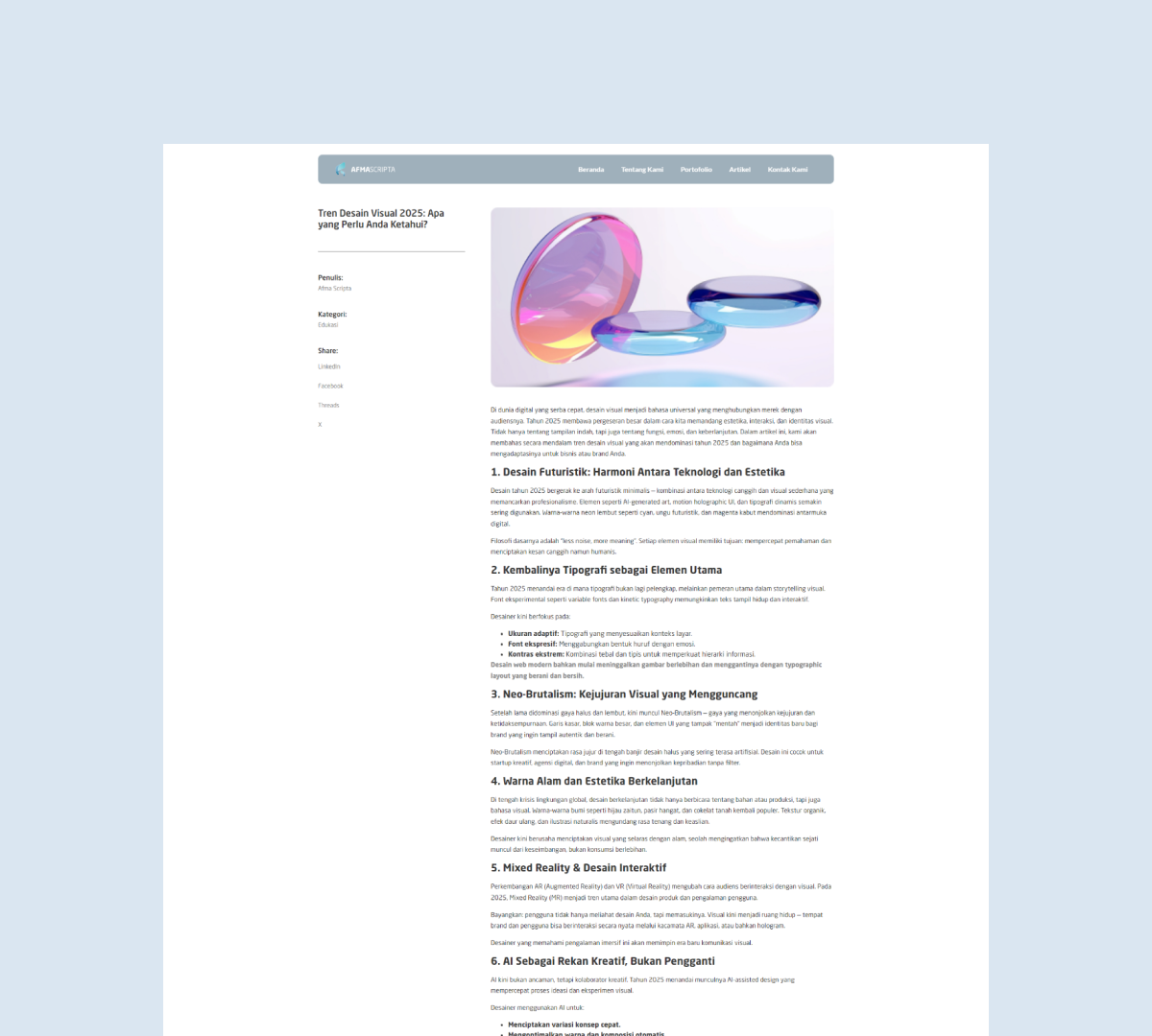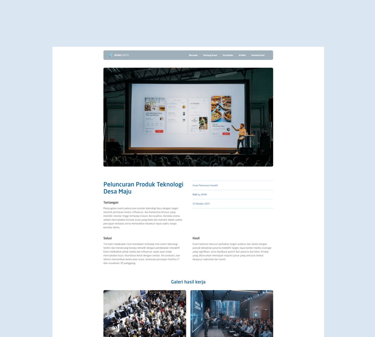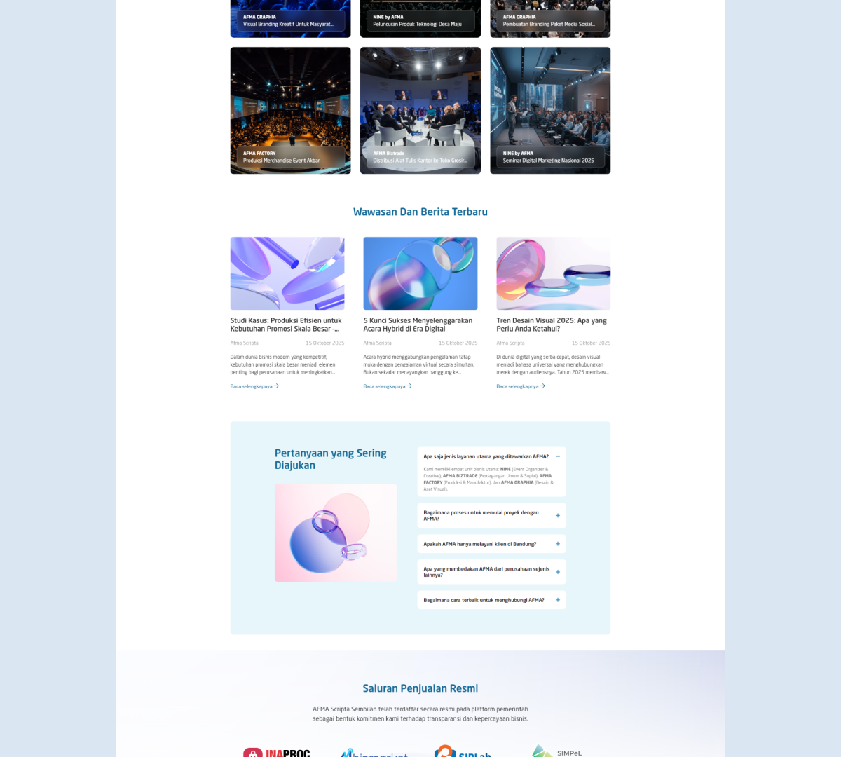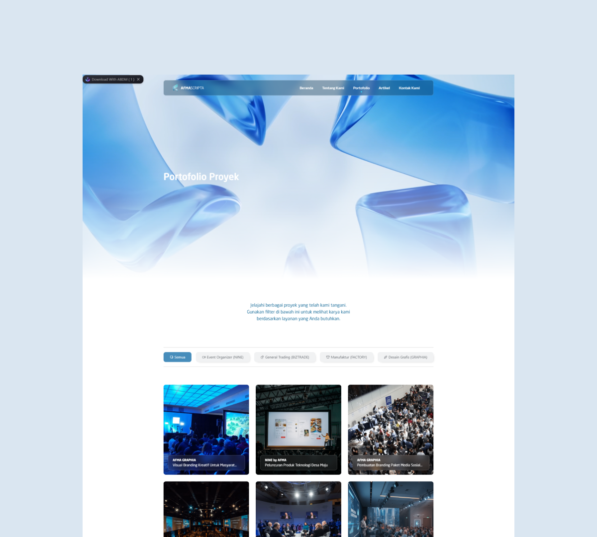 Afma Scripta Sembilan adalah sebuah perusahaan kreatif yang berfokus pada layanan profesional di bidang trading, manufaktur, dan layanan pendukung bisnis di Indonesia. Website ini dirancang untuk menampilkan profil perusahaan, layanan unggulan, dan portofolio produk dengan tujuan memperkuat branding dan menunjang komunikasi bisnis dengan klien dan mitra.